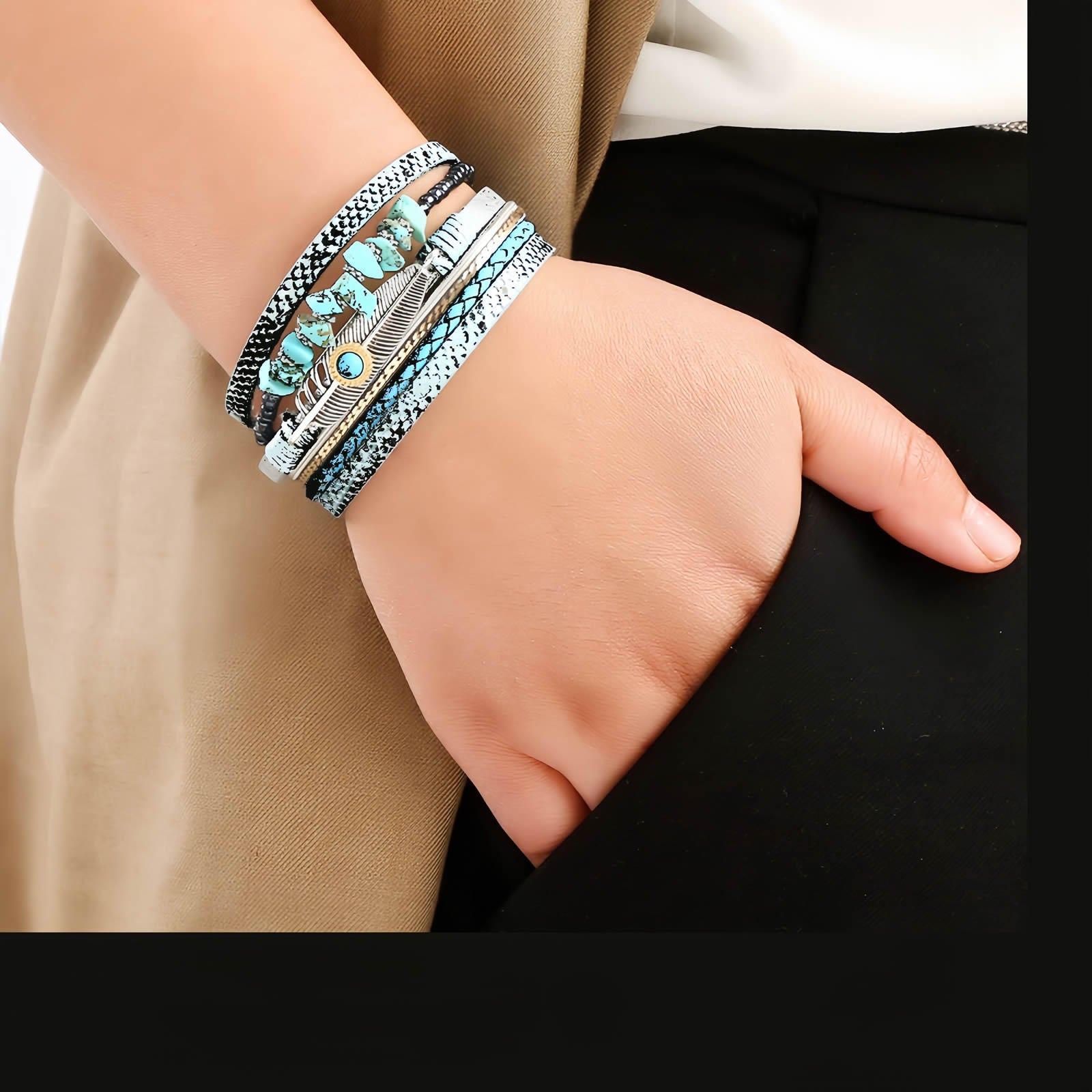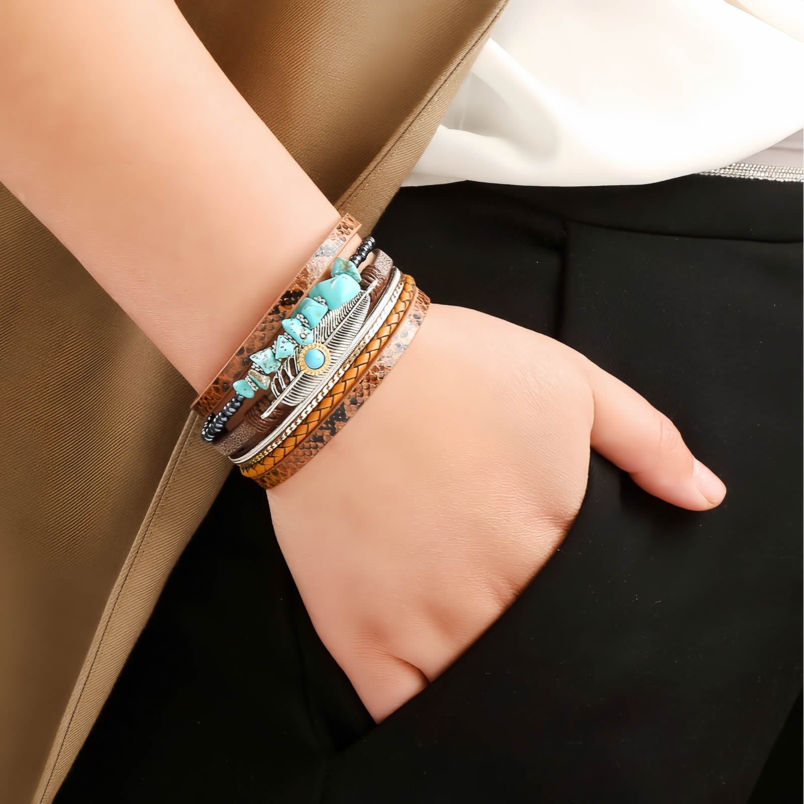 Handcrafted with care, this multi-layer braided wristband features genuine turquoise stone beads, soft leather strands, and feather-inspired accents that create a unique, free-spirited style.