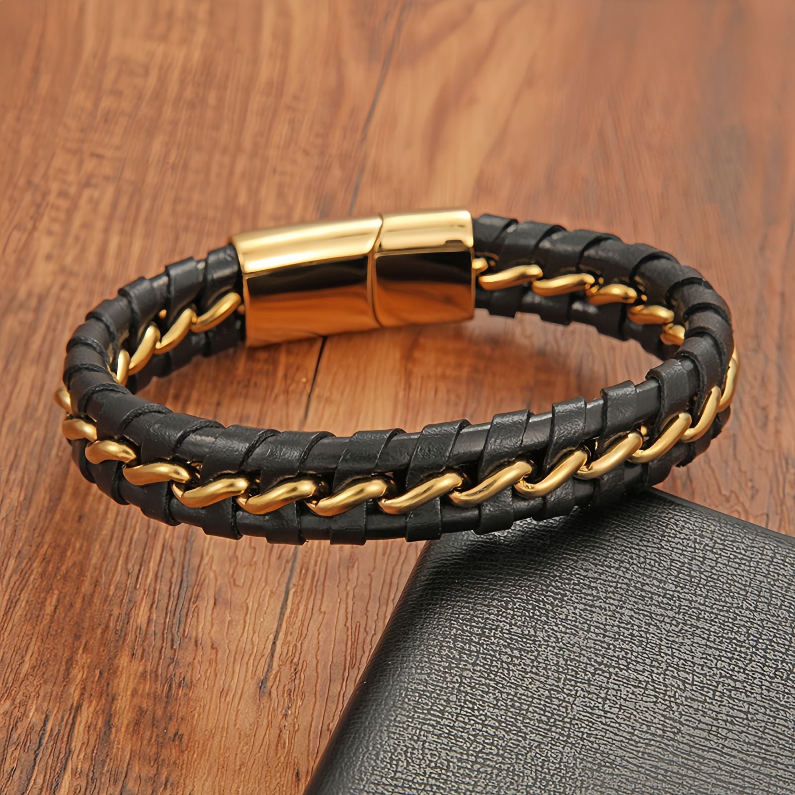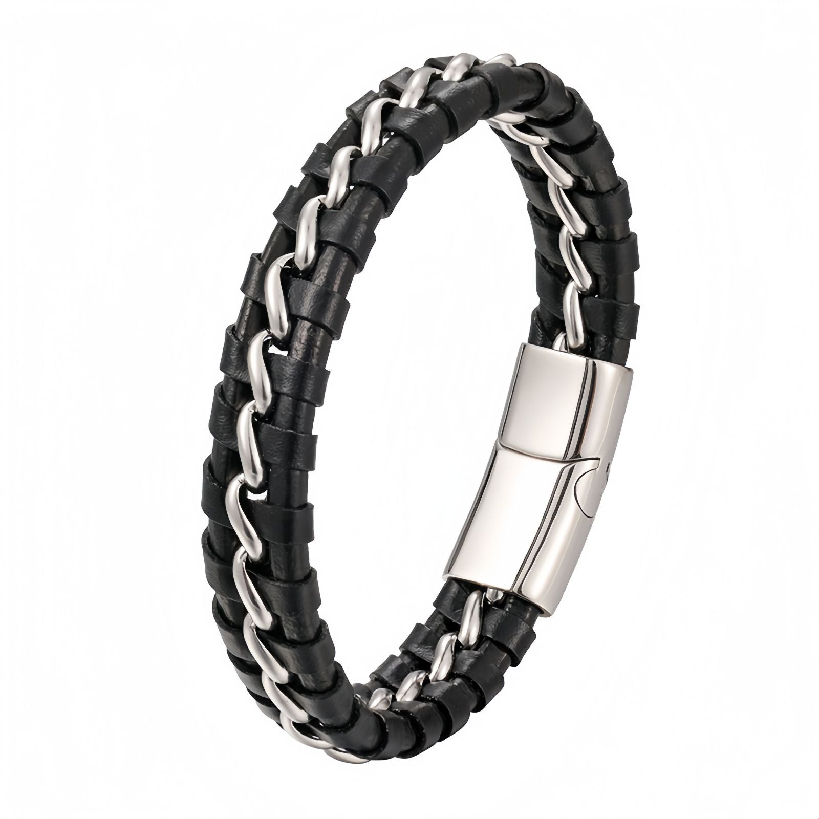 This titanium steel men’s bracelet combines a bold chain-link centerpiece with braided leather for a clean, masculine style. Designed for long-term shine and comfort, it resists fading and keeps its refined finish even with daily wear. The polished clasp adds a sleek touch while ensuring secure, effortless fastening—making it a go-to accessory for everyday confidence.