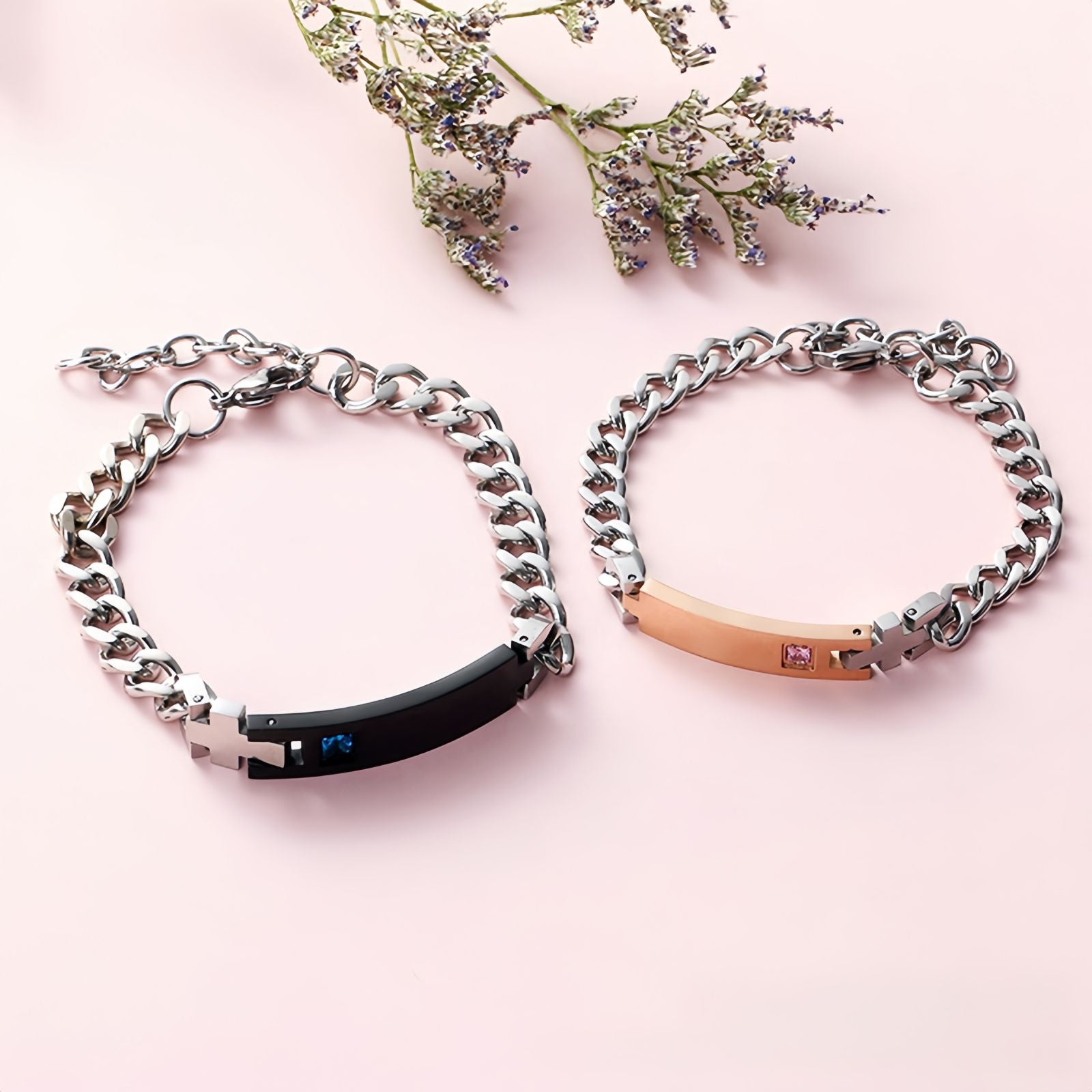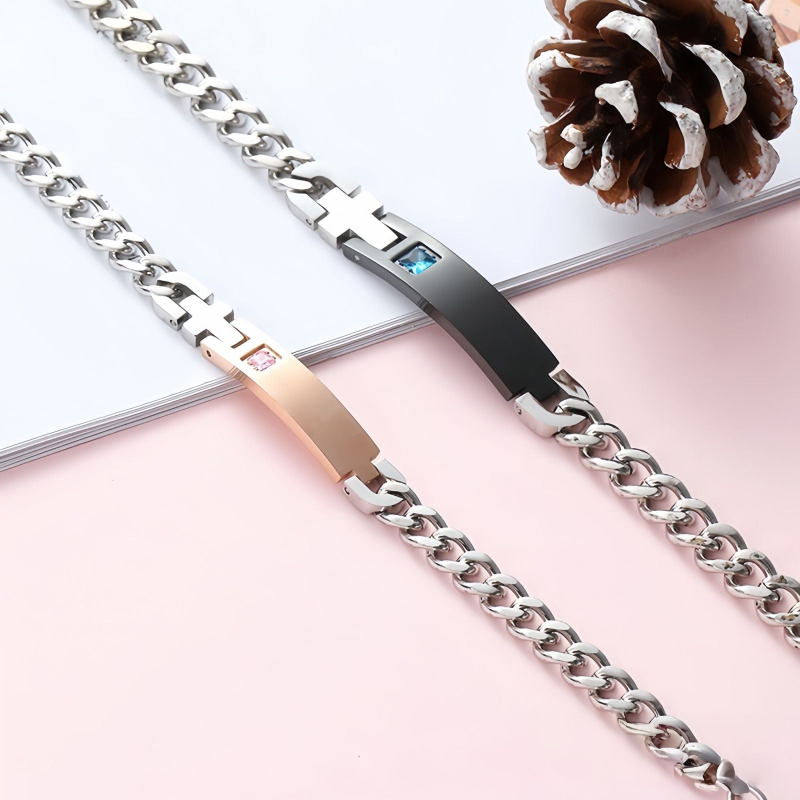 This Cross Bar Cuban Chain Couple Bracelet Set combines clean lines with meaningful design.