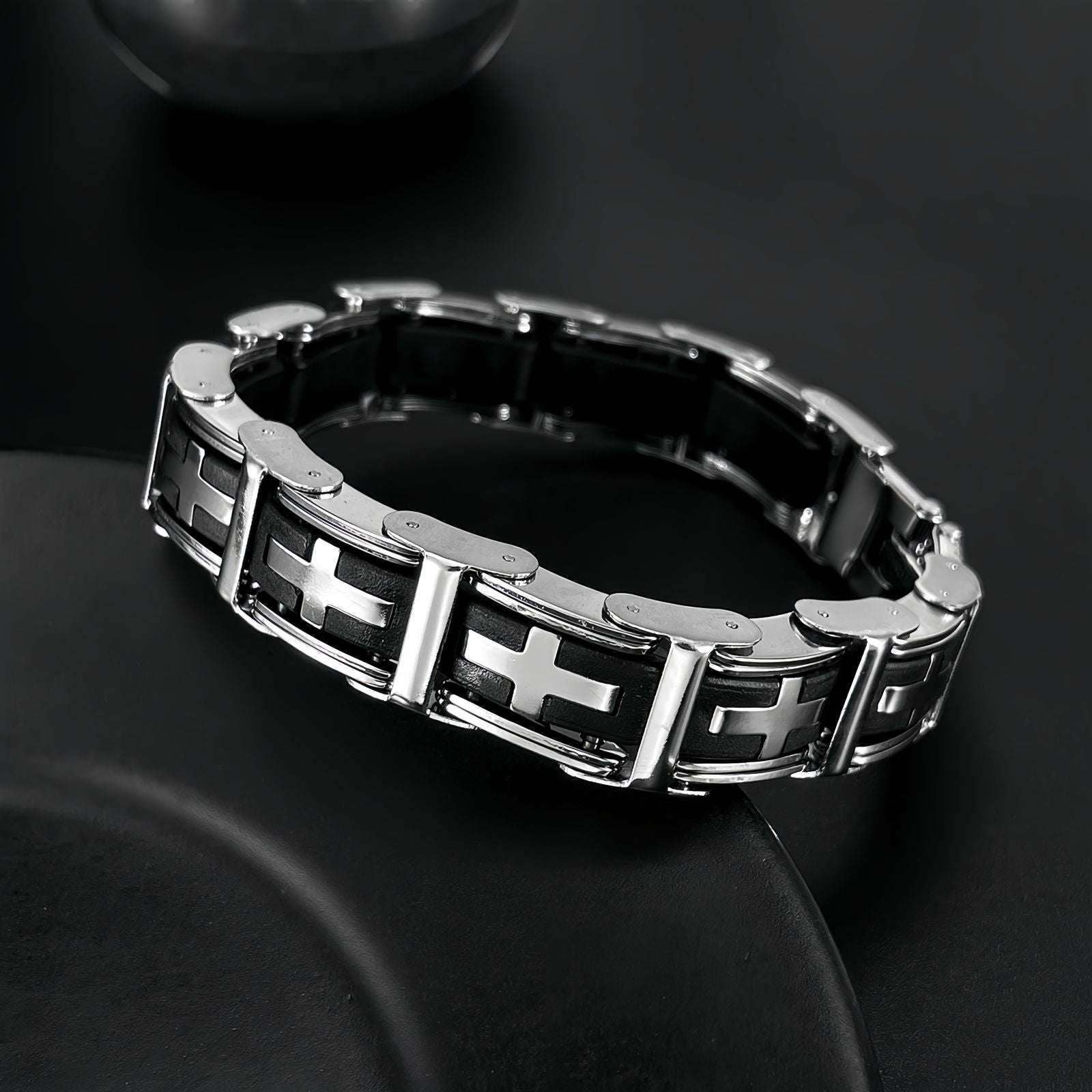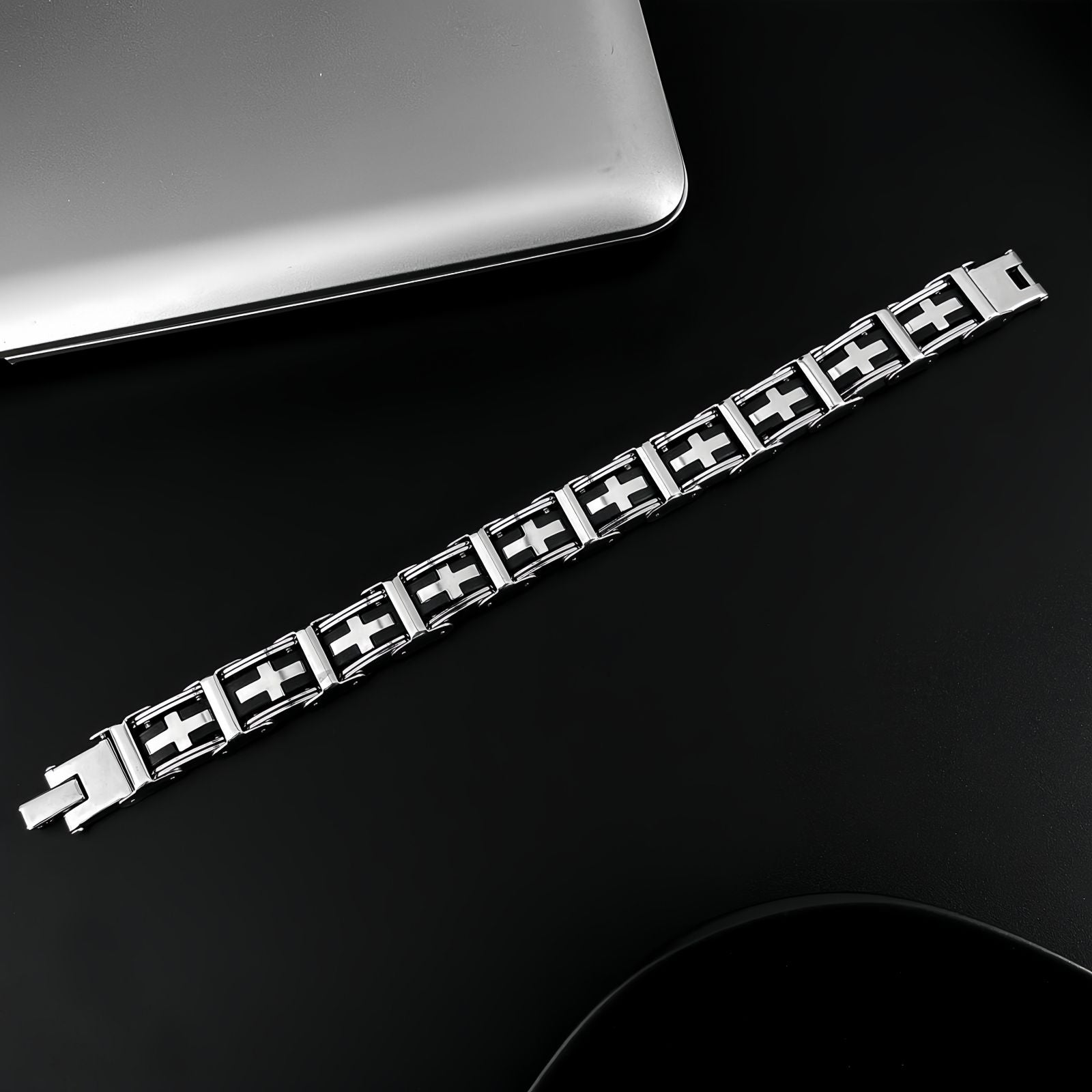 This Cross Inlay Stainless Steel Link Bracelet is crafted for men who prefer bold structure and confident design. The bracelet features segmented stainless steel links with cross-shaped inlay details and a silicone inner layer, creating a strong visual rhythm and a solid, watch-style feel. Its structured build delivers both comfort and presence, making it a standout accessory for everyday wear.