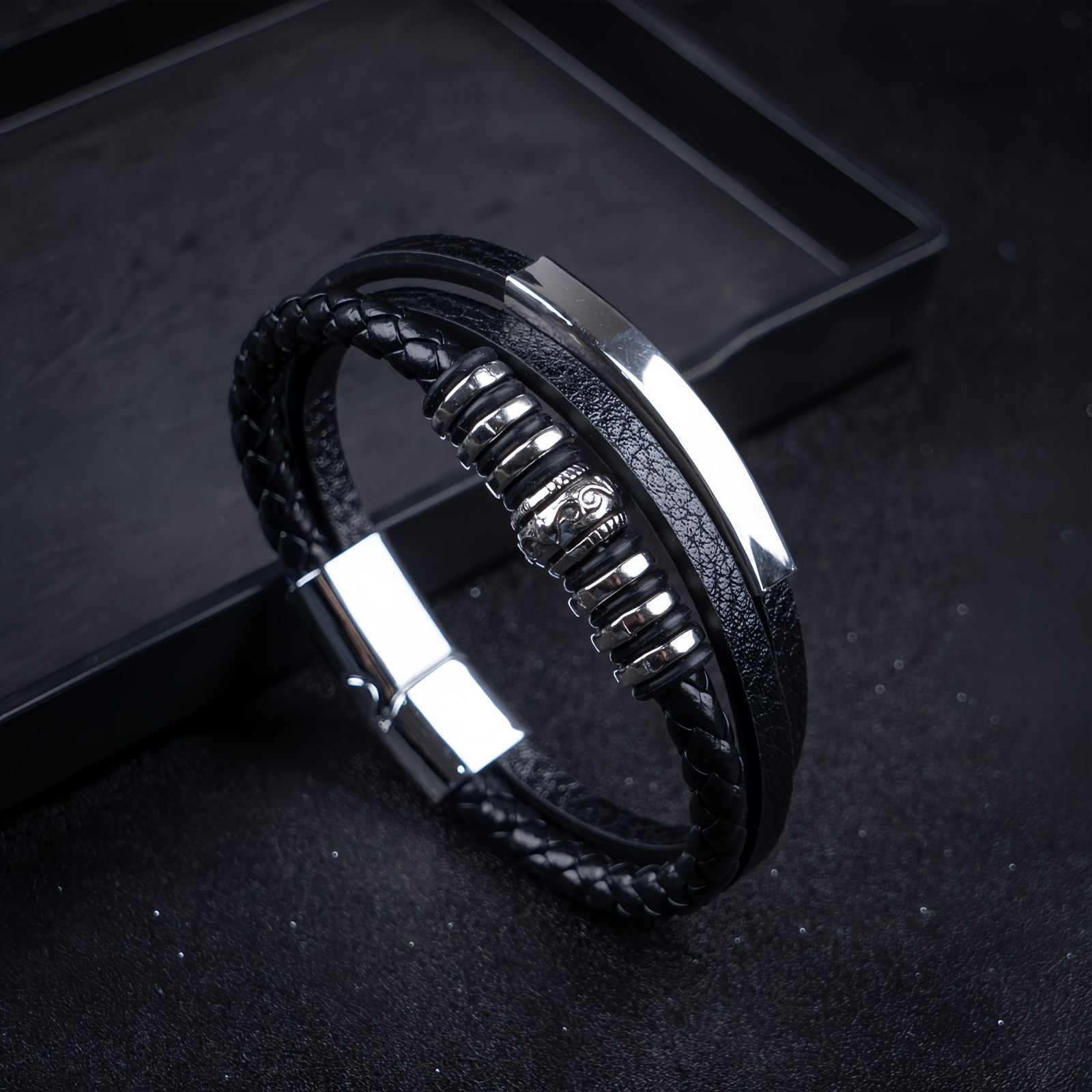 Designed to stand out without trying too hard, this Decorative Metal Ring Men’s Leather Bracelet blends layered PU leather straps with sleek metal rings for a strong, structured look. The multi-strand composition creates depth, while the magnetic clasp offers quick, secure fastening. Whether you are dressing up or keeping it casual, this bracelet adds a confident edge to your everyday style.