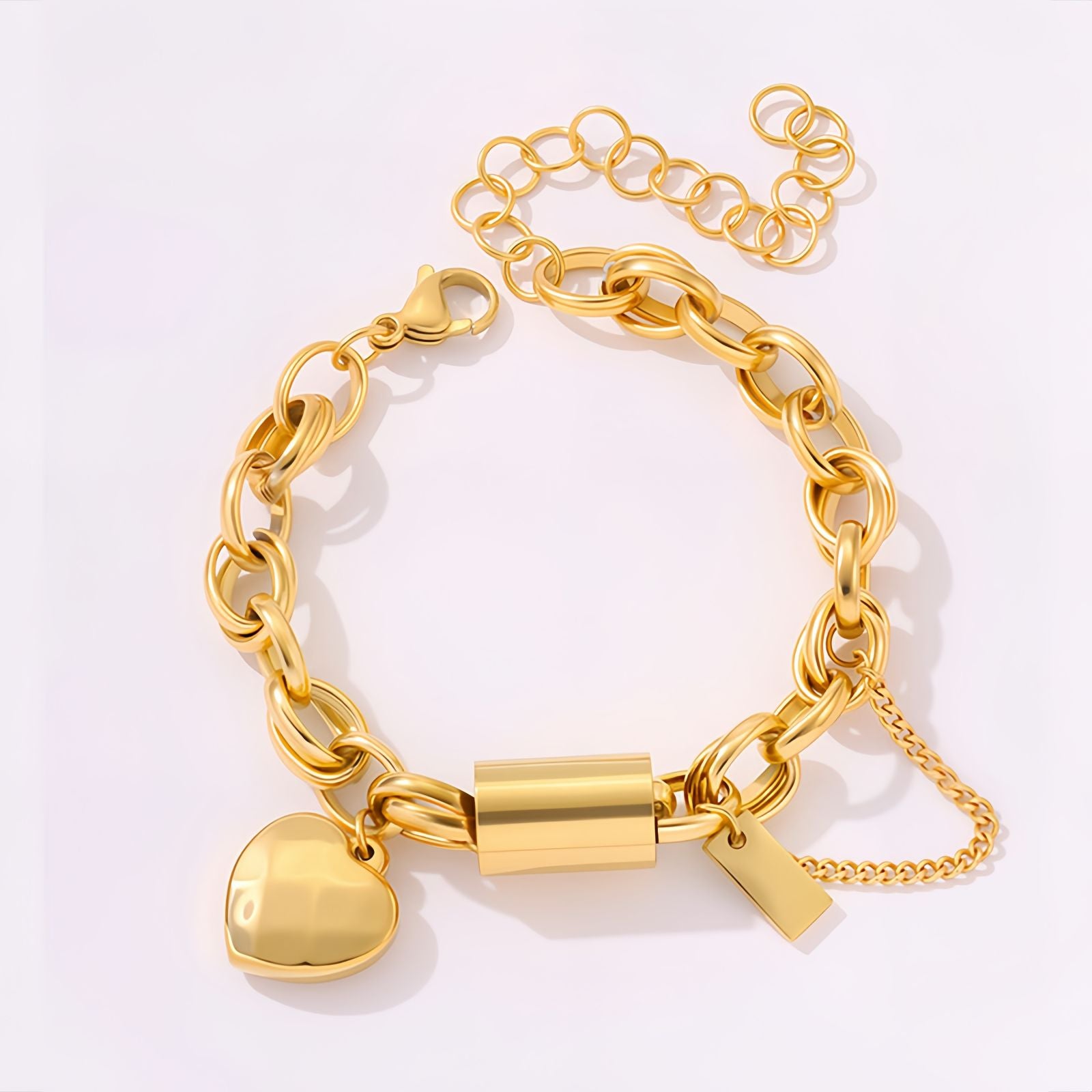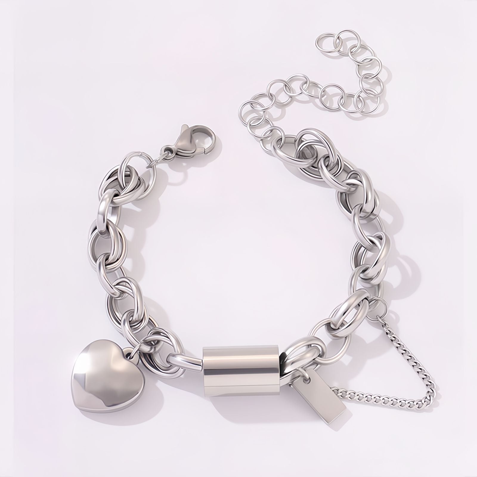 This heart charm oval link chain stainless steel bracelet features a refined metal chain design paired with a subtle heart accent for a clean yet expressive look. The oval link structure creates a smooth, flowing silhouette, while the heart charm adds a gentle romantic touch without feeling overly decorative. Crafted from high-quality stainless steel, this bracelet is designed for daily wear with lasting durability and a polished finish.