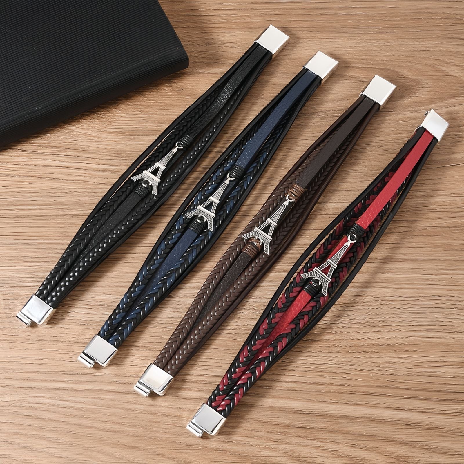 Elevate your everyday style with this Men's Vintage Eiffel Tower Leather Bracelet. Designed with a distinctive multi-layer strap, combining braided cords and flat leather, it delivers a structured yet effortless look. The detailed Eiffel Tower charm adds a unique character, making this piece stand out from standard men's leather bracelets.