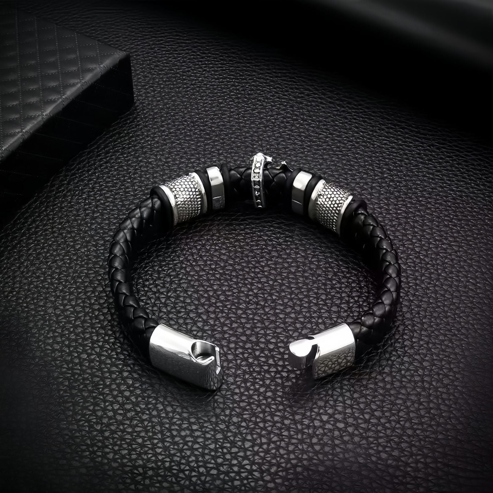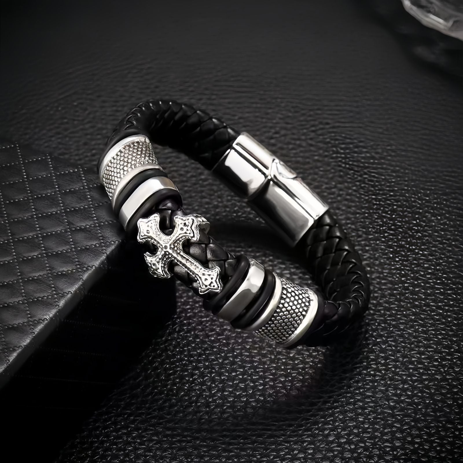 Punk-Inspired Cross Charm Men’s Double-Braided Leather Bracelet