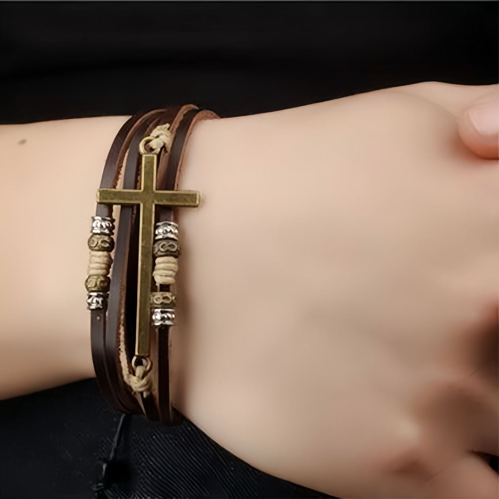 Give your everyday style a touch of meaning with this Women’s Cross Bar Layered Leather Bracelet. Designed with layered brown leather straps and accented with alloy beads and a vintage cross charm, this bracelet is adjustable with a pull-cord fit, allowing it to comfortably adapt from slim to wider wrists. Whether worn alone or stacked with other bracelets, it’s a stylish expression of personal belief, vintage fashion and effortless comfort.